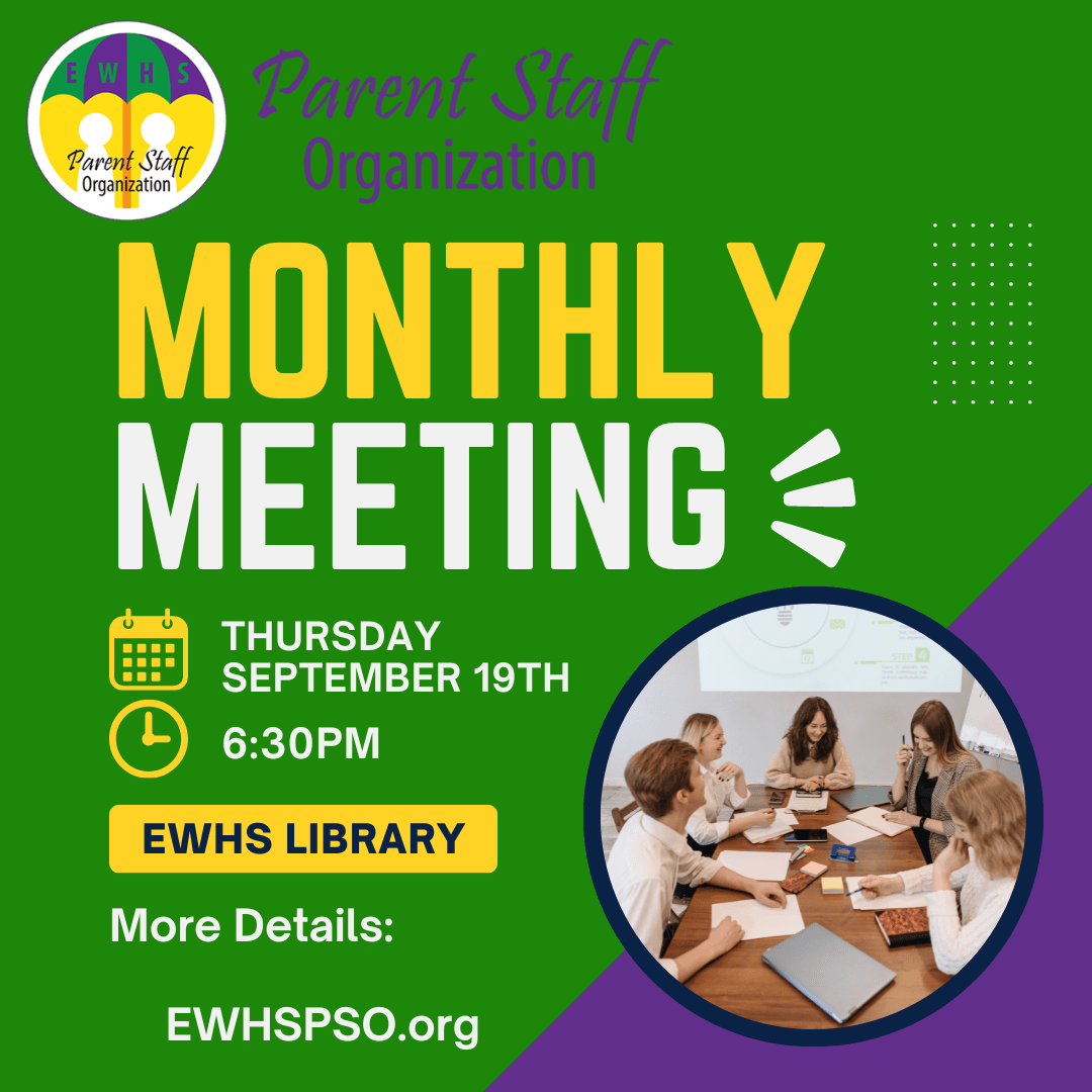 We’re looking forward to our first Parent Staff Organization meeting on Thursday, September 19th at 630pm in the EWHS Library, where we’ll be focused on finalizing our plans for the coming year with the goal of: