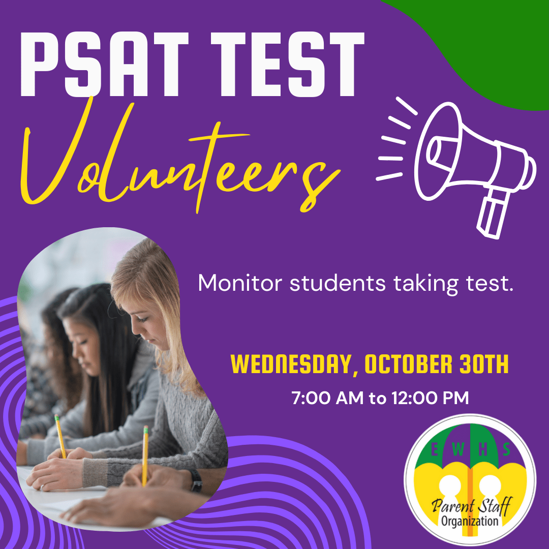 Edmonds Woodway is hosting a PSAT exam for Juniors on Wednesday, October 30 and is in need of parents of volunteers for test monitoring. The test is being held from 7 AM to 12 PM and the ideal volunteer is able to cover this entire shift, however if needed volunteers can cover a portion of this time.