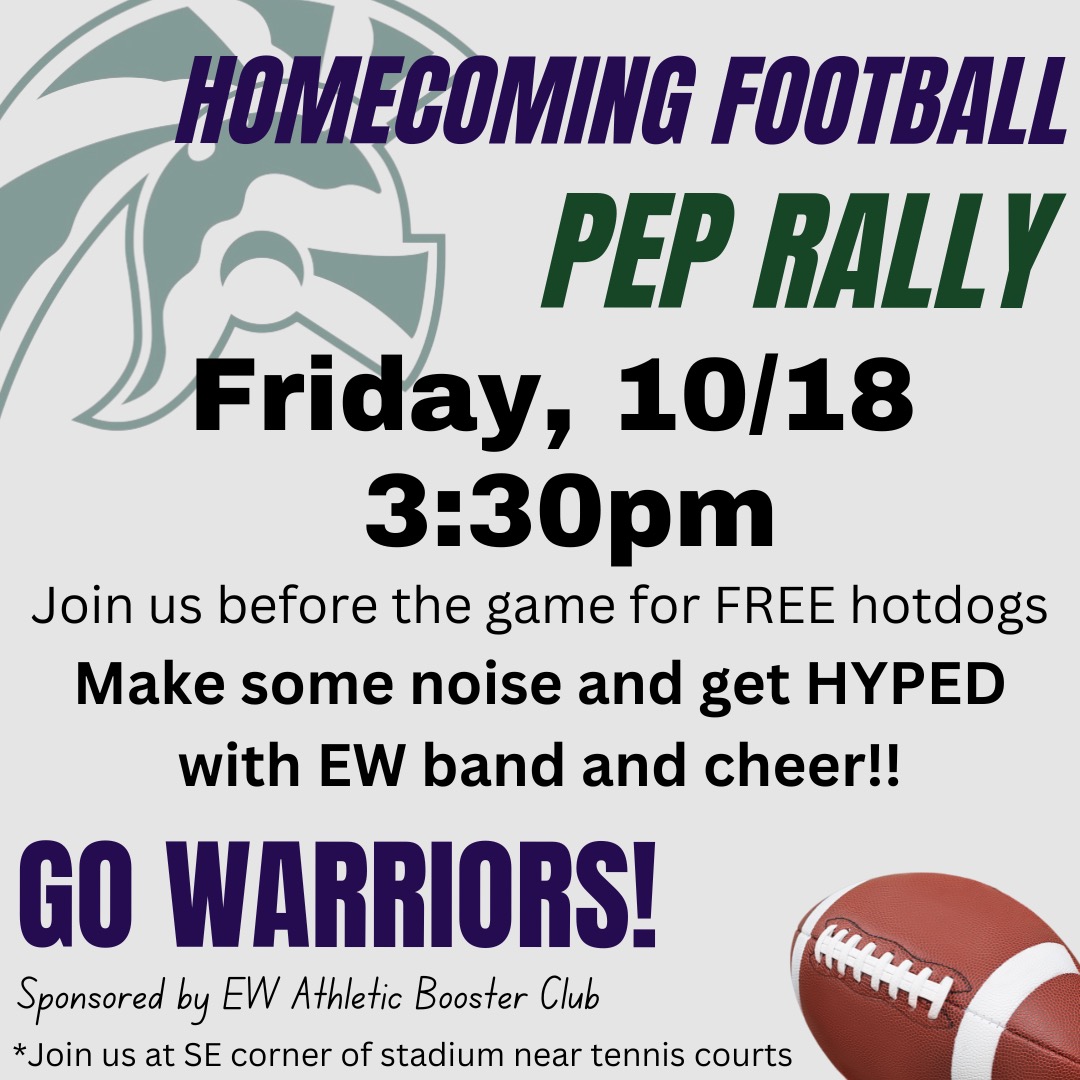 Get hyped for the game with EW Band & Cheer and enjoy free hotdogs compliments of the Athletic Boosters… then head to the game to cheer the football team to a victory against Shorewood.