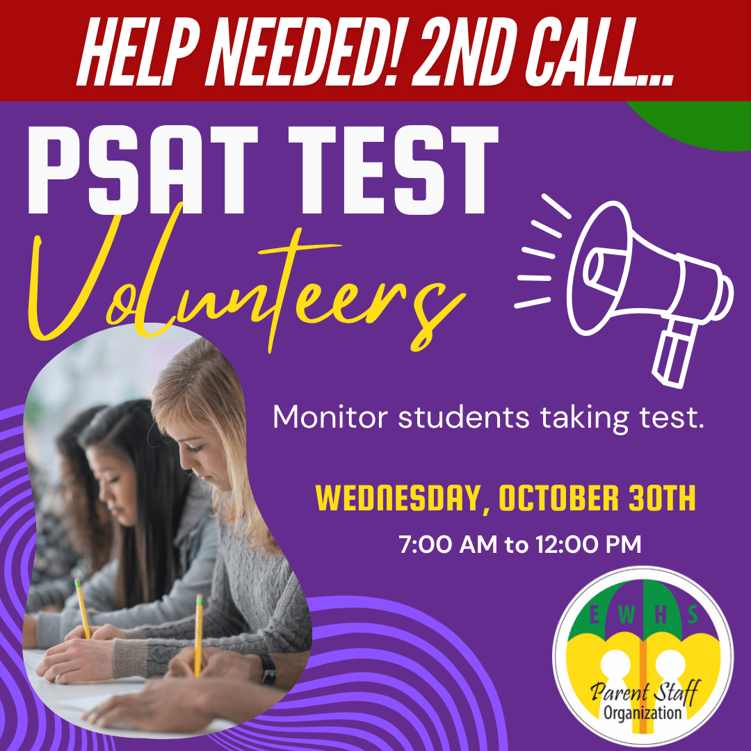 📣 Calling all parents! Our Juniors need your support! 🙌 Without volunteers to serve as test monitors for the PSAT on Wednesday, October 30th, from 7 AM to 12 PM at Edmonds Woodway High School, we won’t be able to hold this crucial exam. Whether you can monitor the whole time or just part of the exam, your help is vital! Just a few hours of your time can make all the difference in our students’ futures. Let’s come together to help them succeed! 💪🎓 Sign up today and be a part of their journey!
