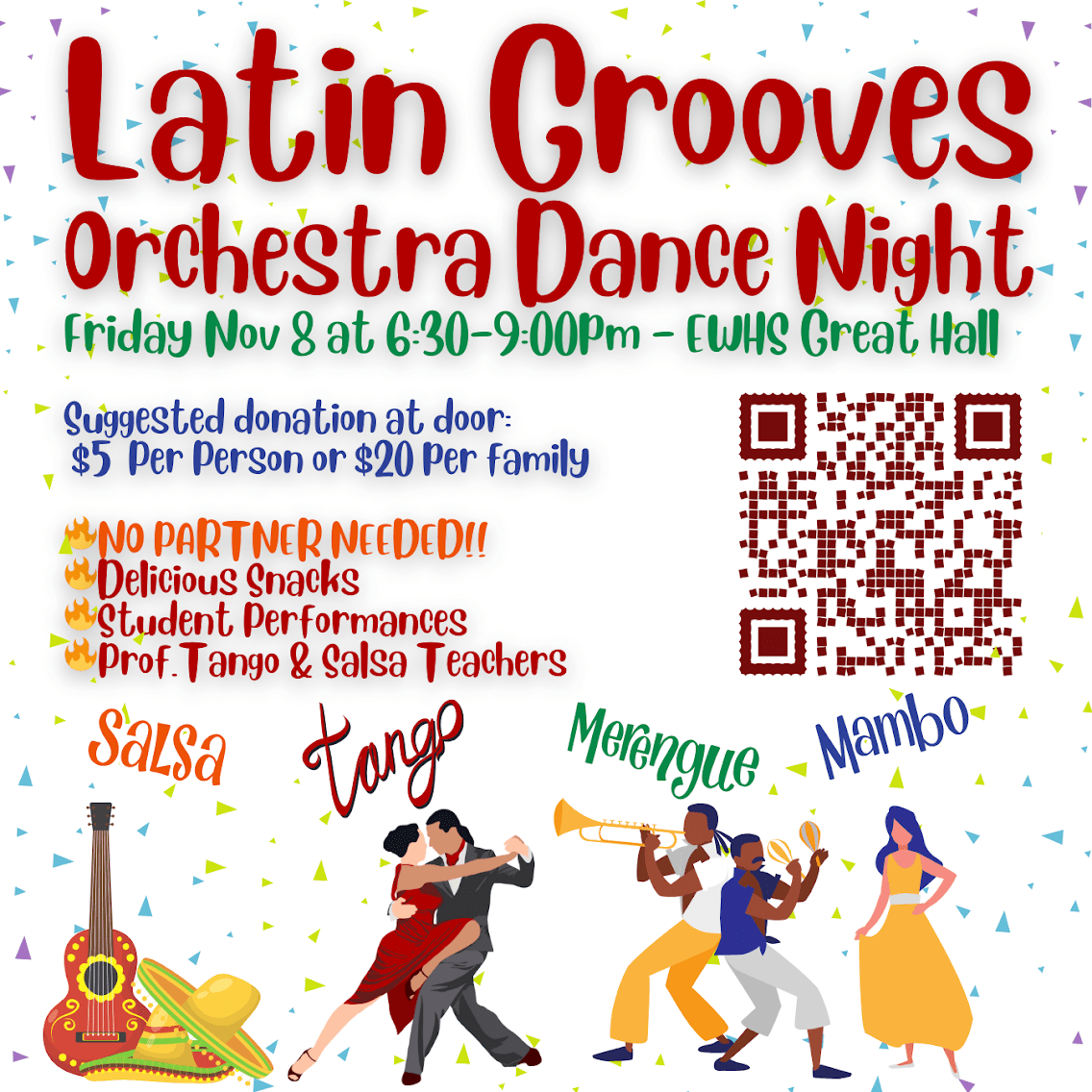 Mark your calendars for an unforgettable evening of music, dance, and fun. Performances by EWHS String Orchestras, Jazz Bands, and the Edmonds Community College Salsa Band. Don’t miss the professional salsa and tango performances, delicious treats, live Latin music, and a chance to dance the night away with friends