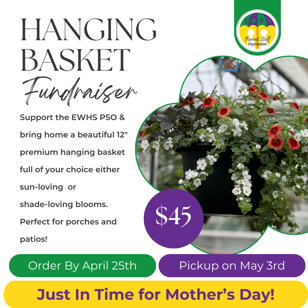 The Edmonds Woodway High School Parent Staff Organization (EWHS PSO) is bringing back our popular Hanging Basket Fundraiser, just in time for Mother’s Day!
