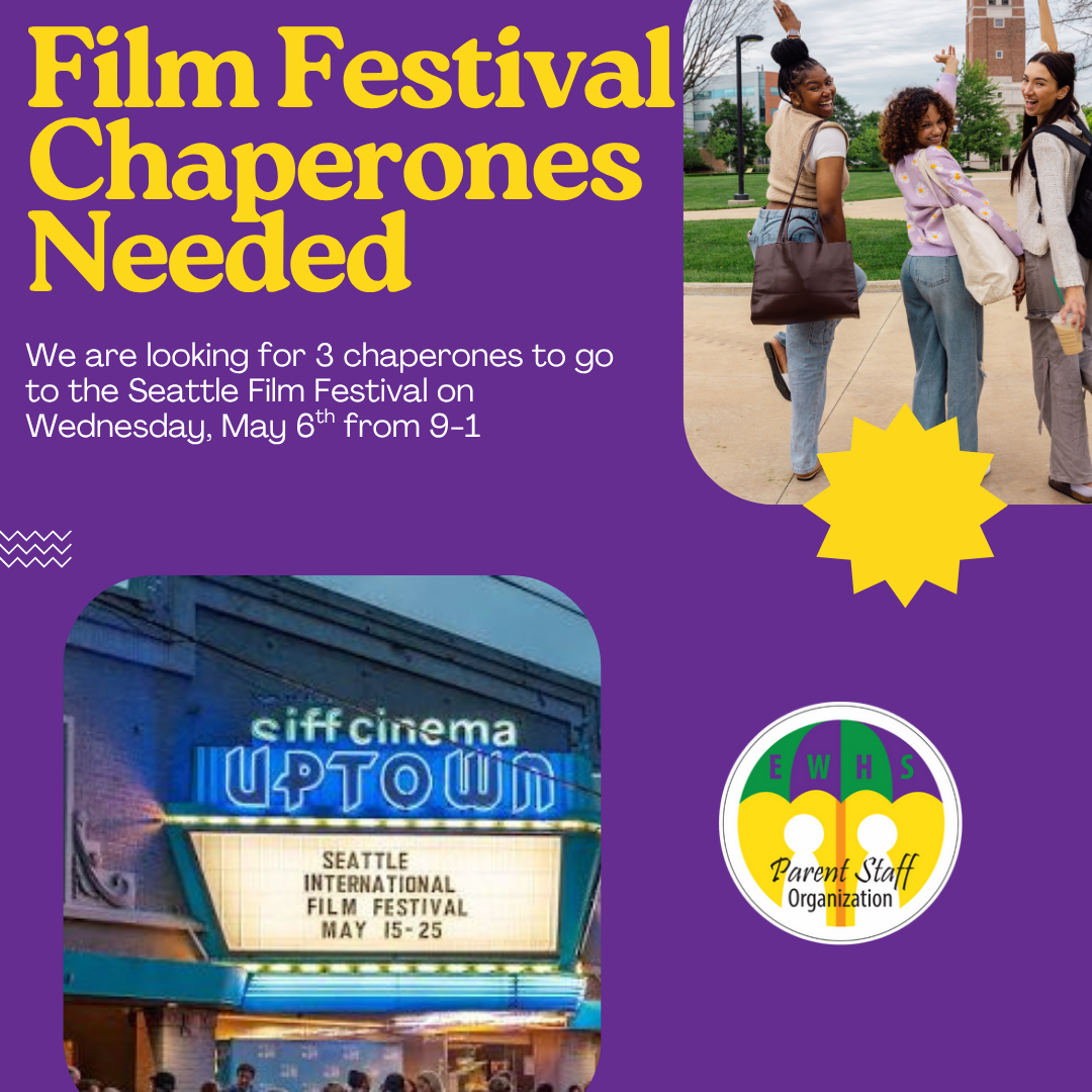We are looking for 3 chaperones to go to the International Film Festival on Wednesday, May 6th from 9-1.