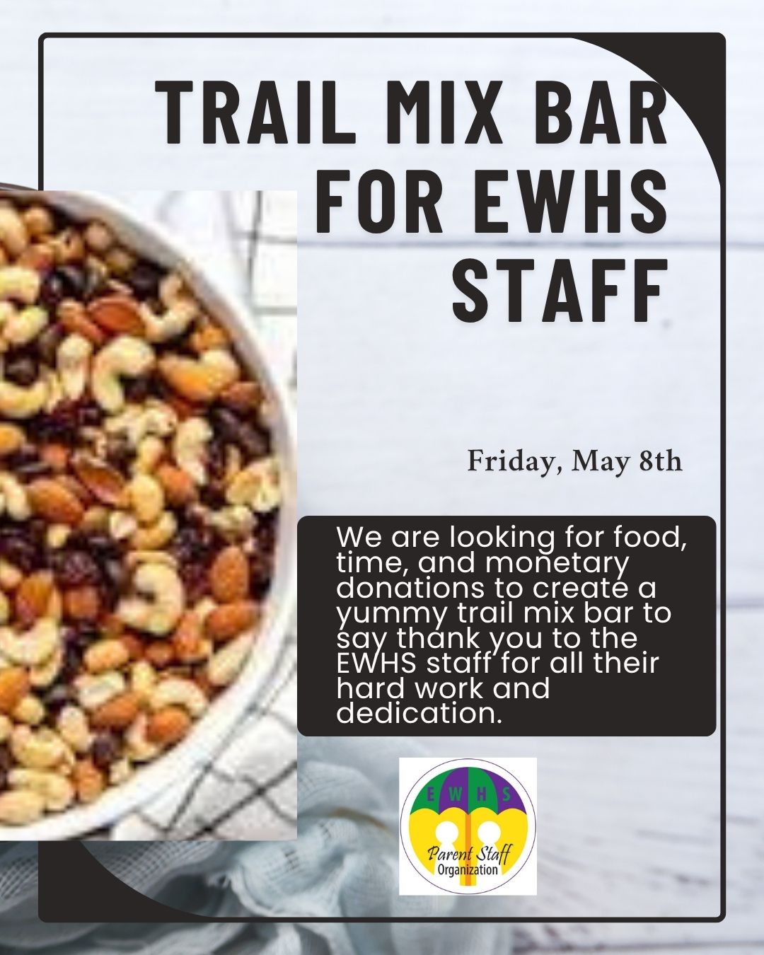 Show the amazing staff at EWHS how much we are thankful for their hard work and dedication. We will be hosting a trail mix bar on Friday, May 8th.
